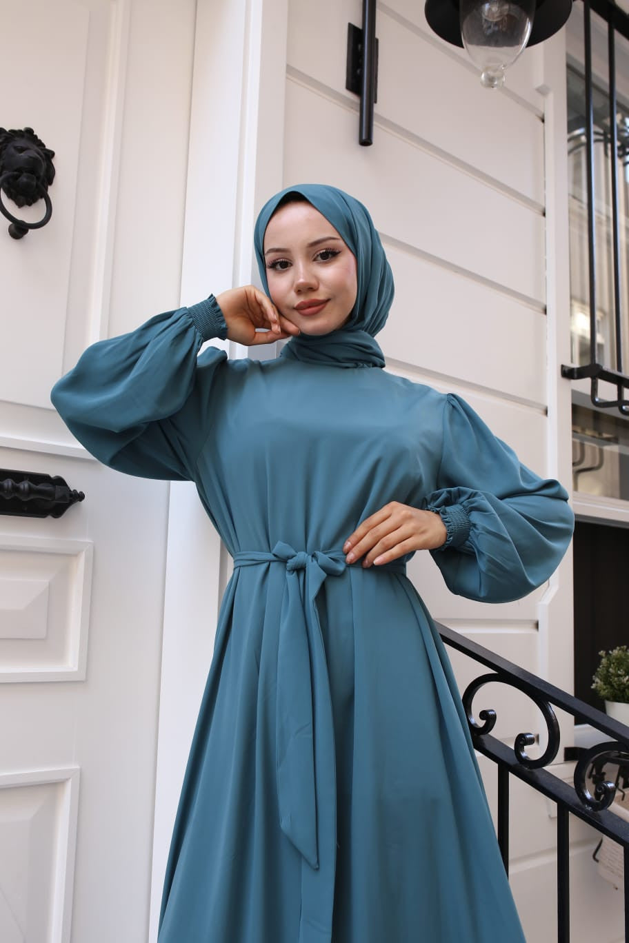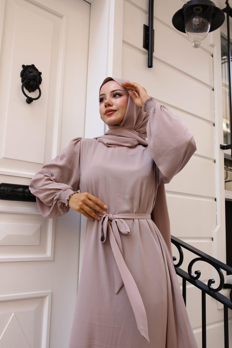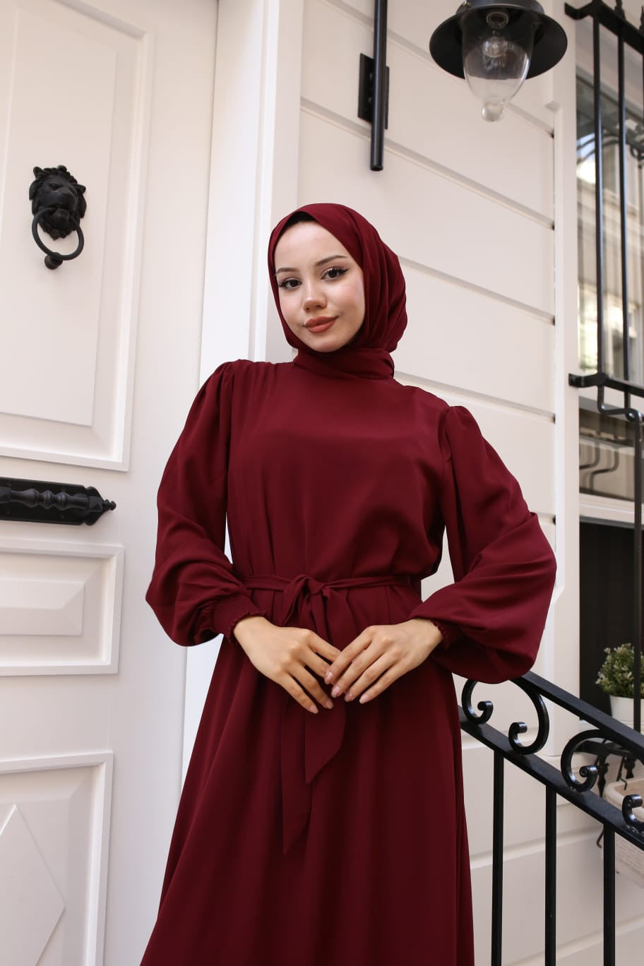 Robe longue col rond , manches larges avec élastique aux poignets , ceinture et foulard en soie de médine inclus.