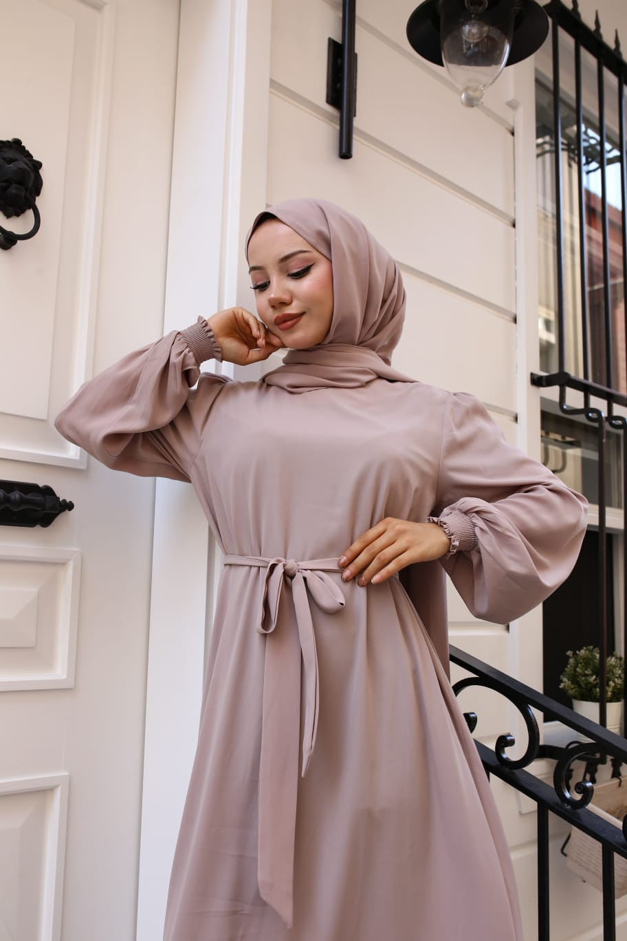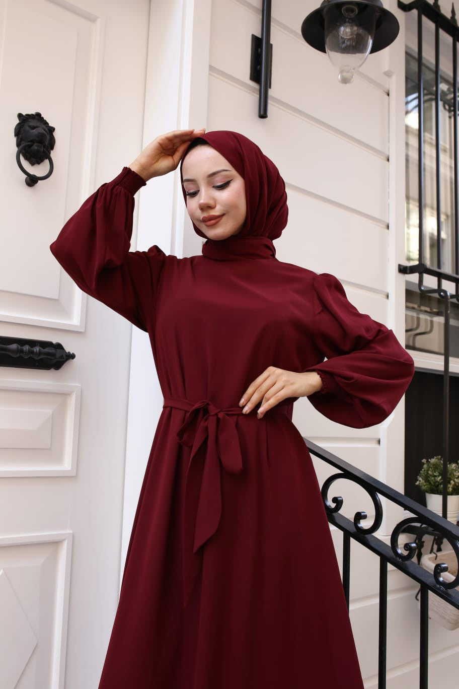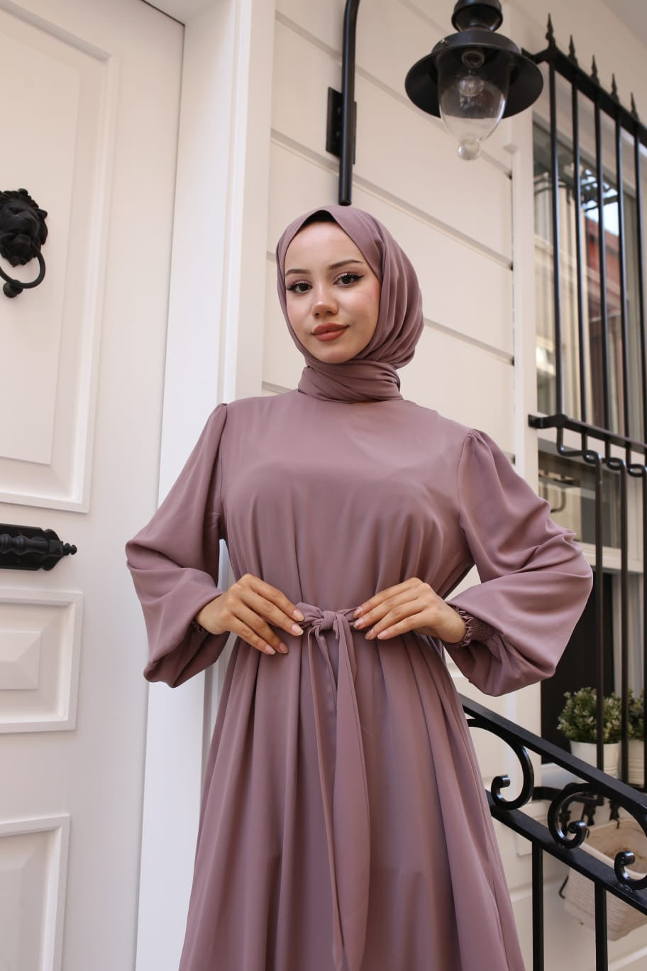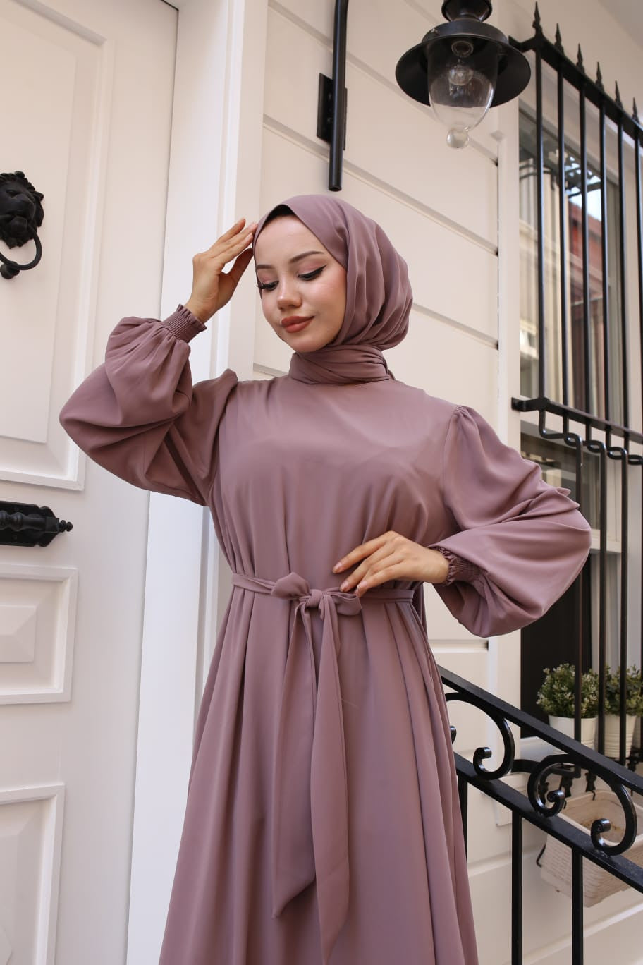Robe longue col rond , manches larges avec élastique aux poignets , ceinture et foulard en soie de médine inclus.