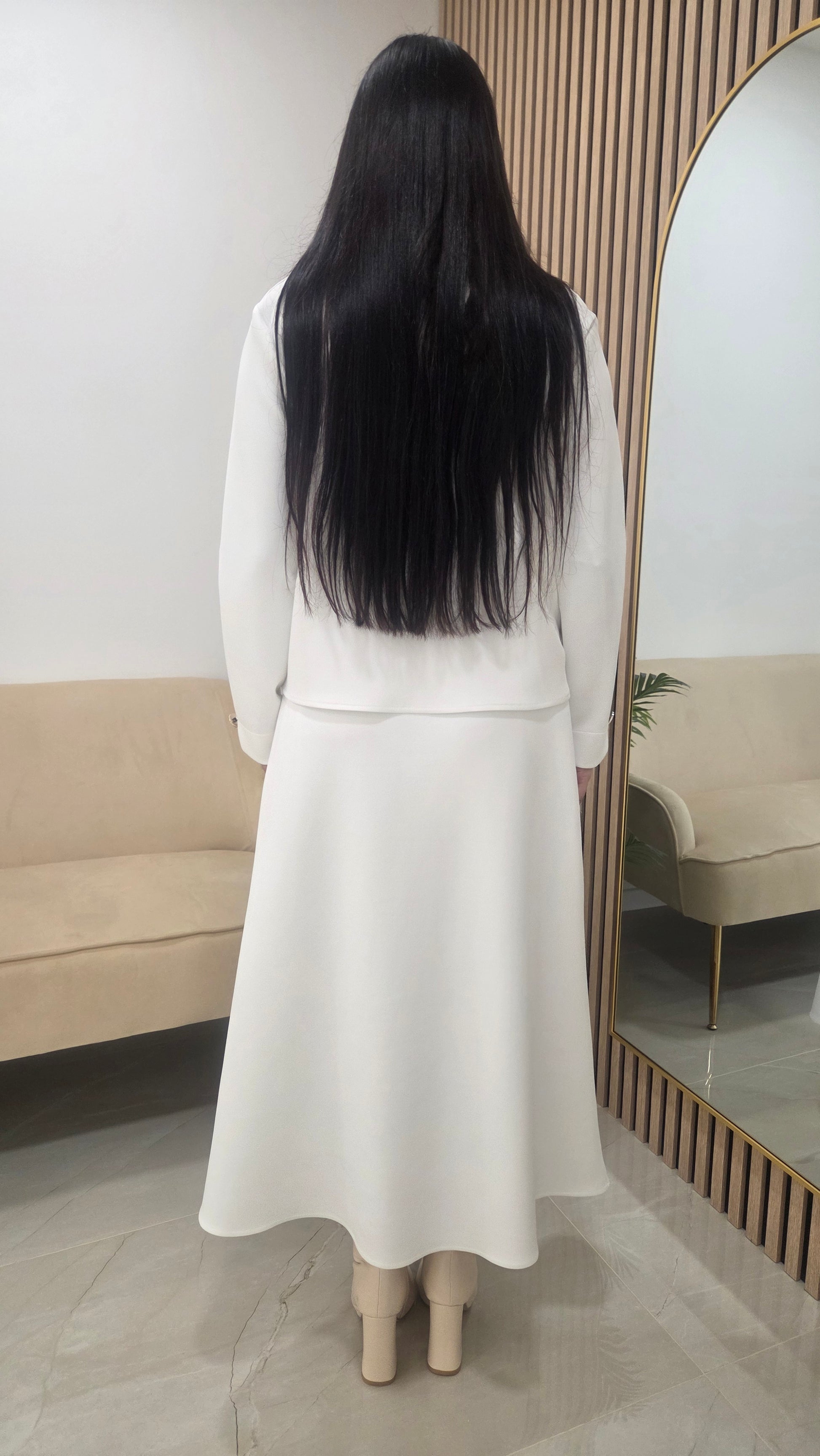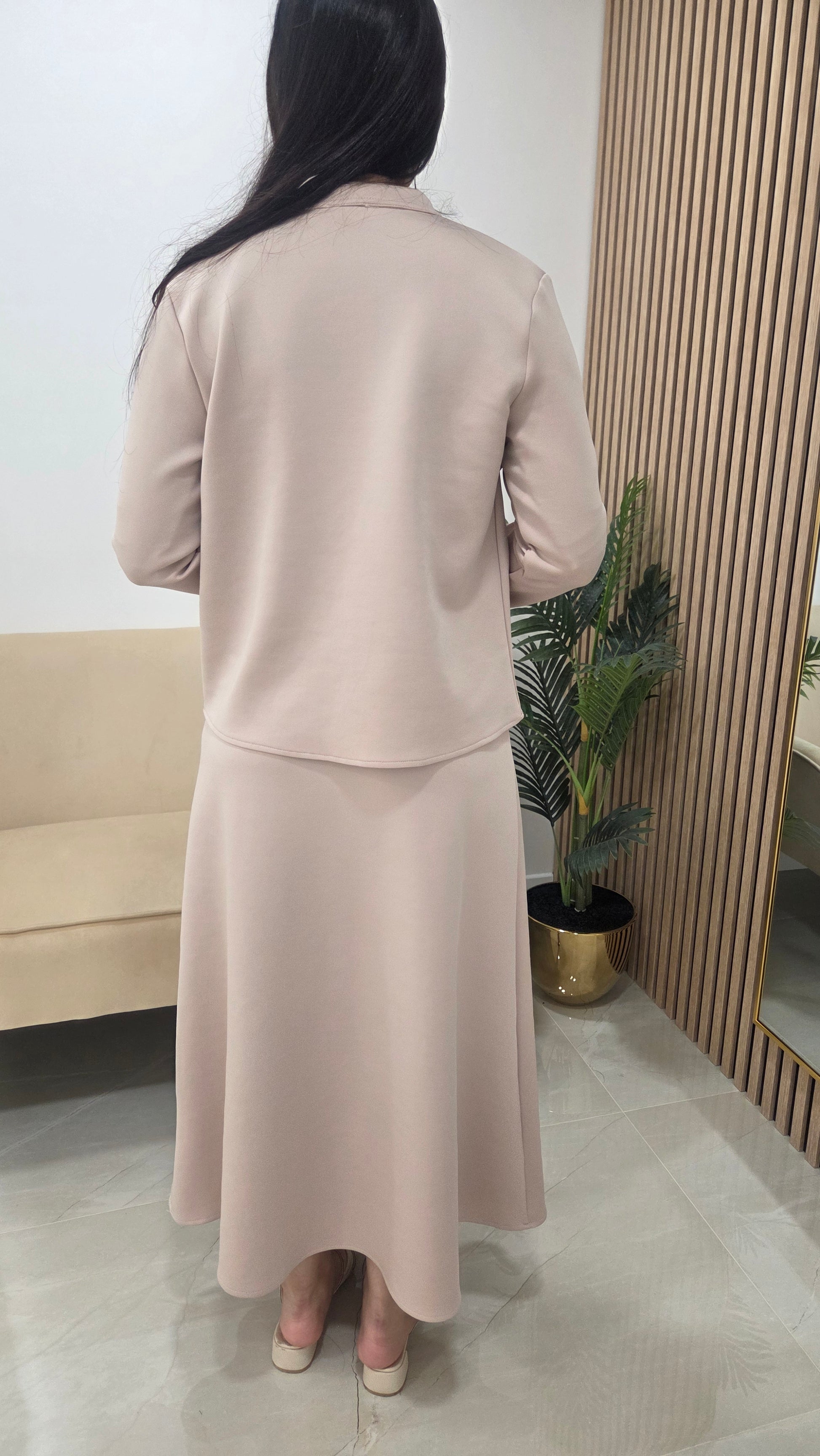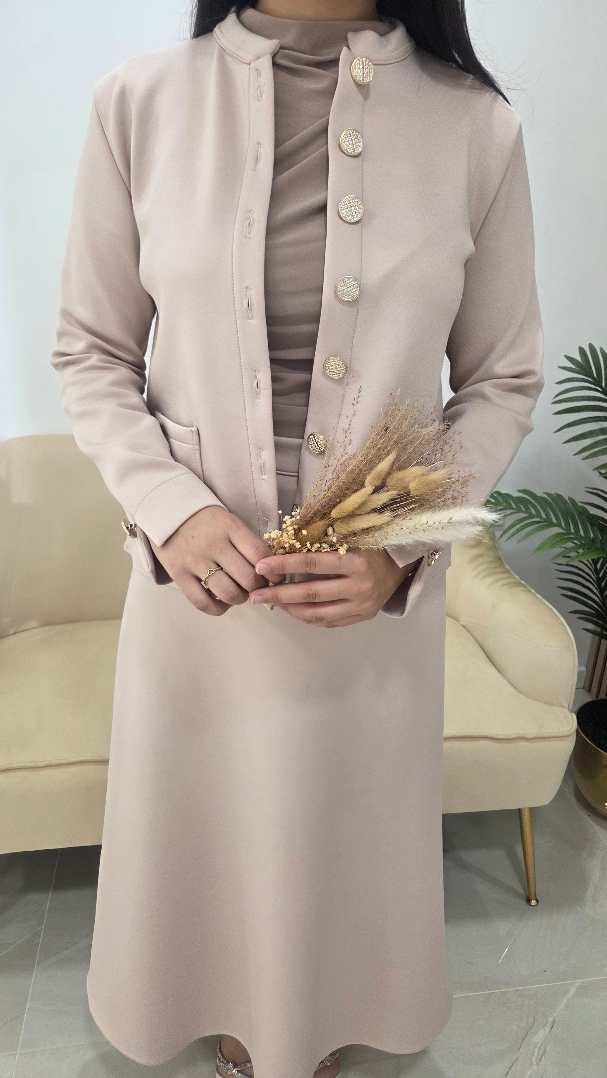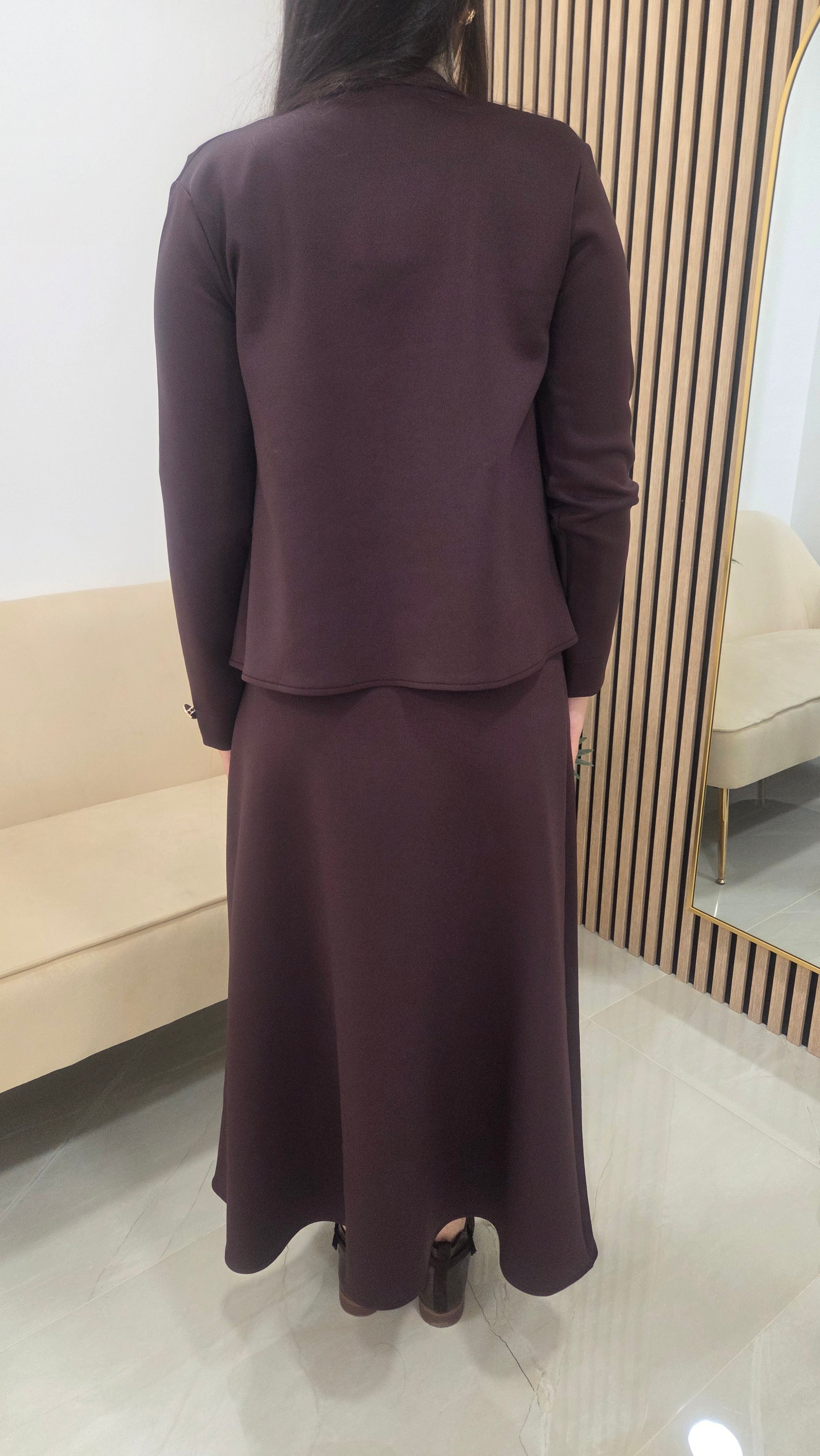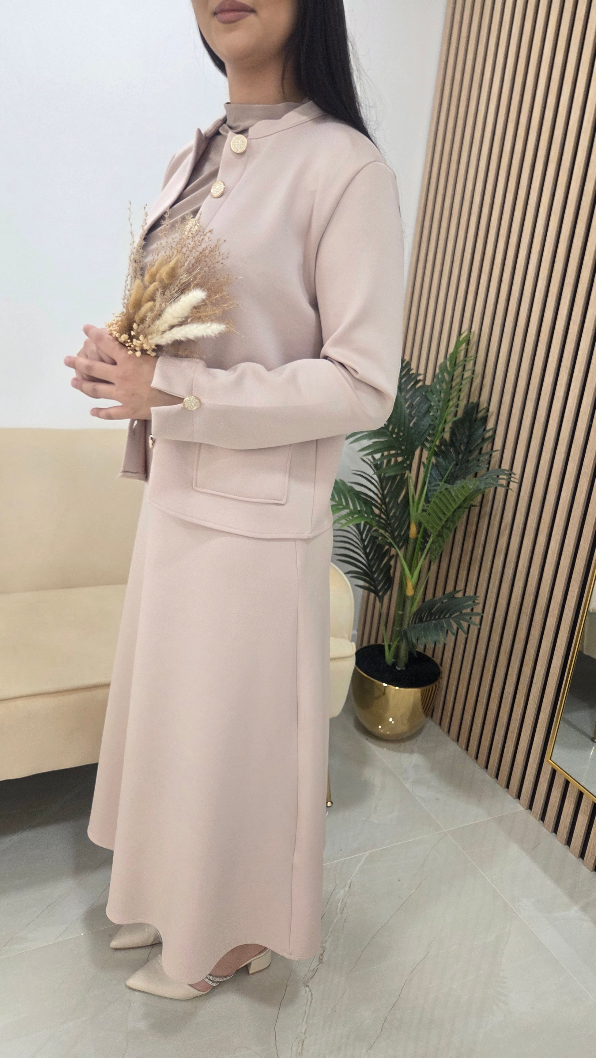 Jolie ensemble composé d'une veste à boutons doré, et une jupe trapèze avec fermeture éclair sur le côté.