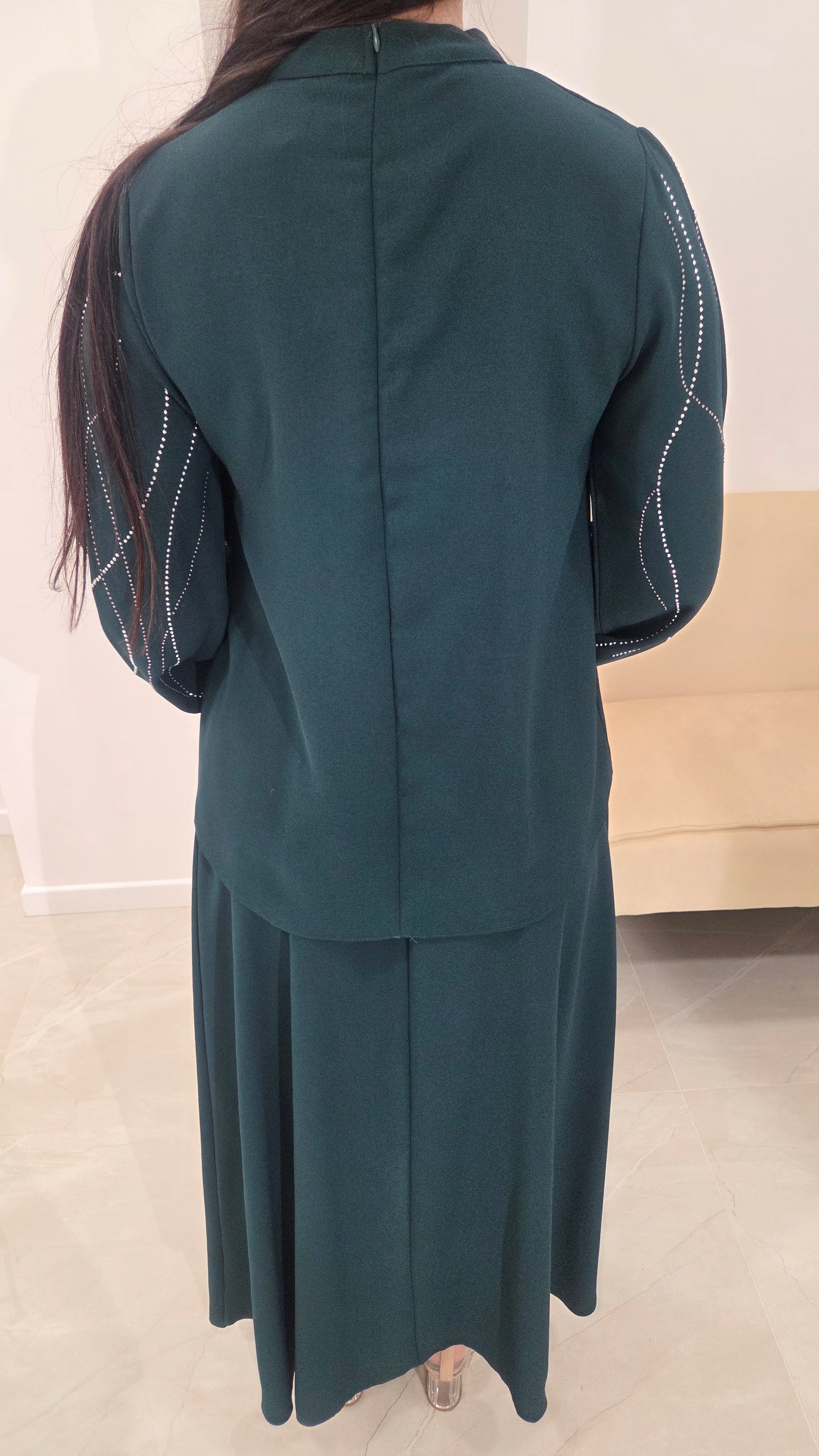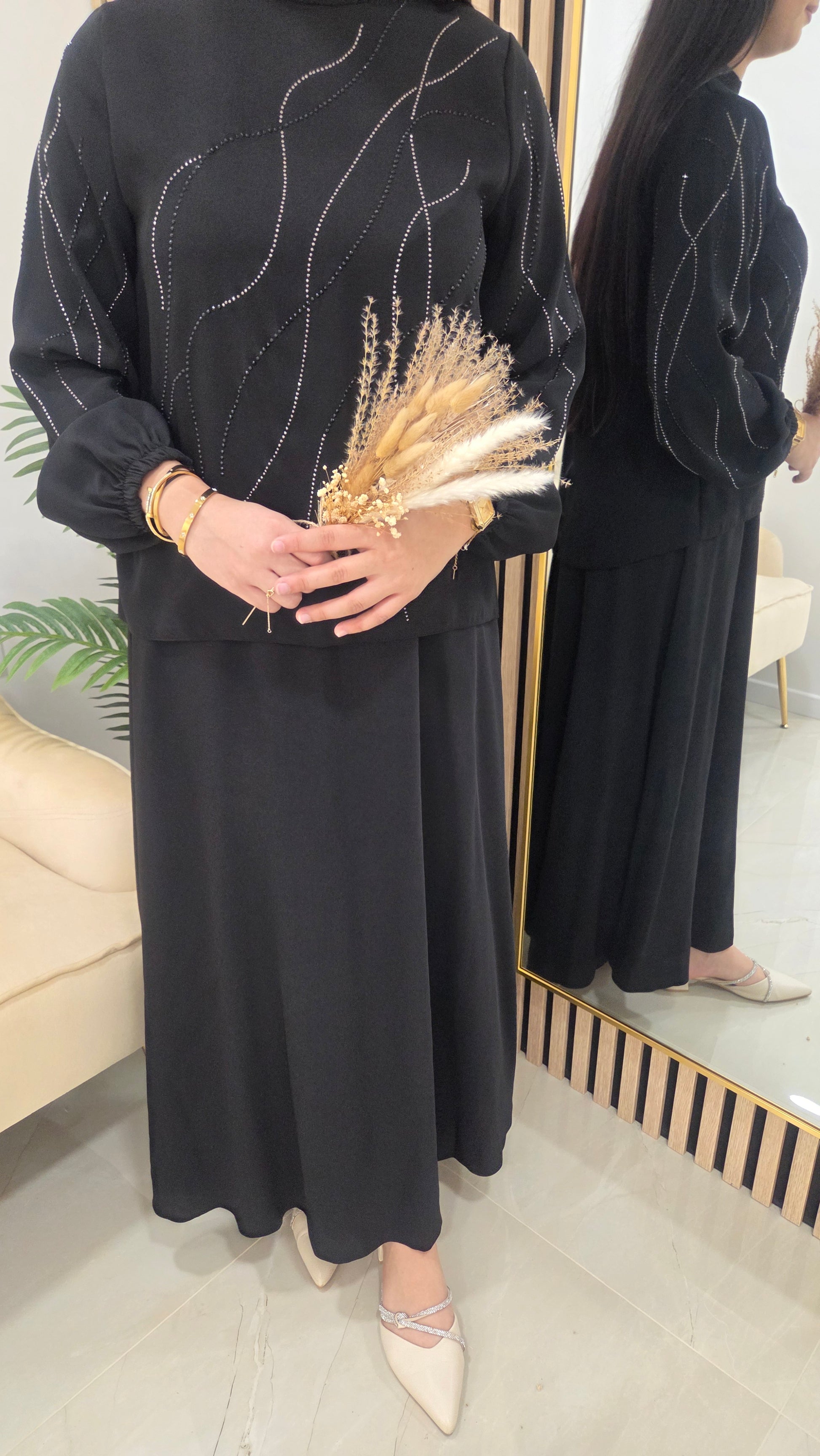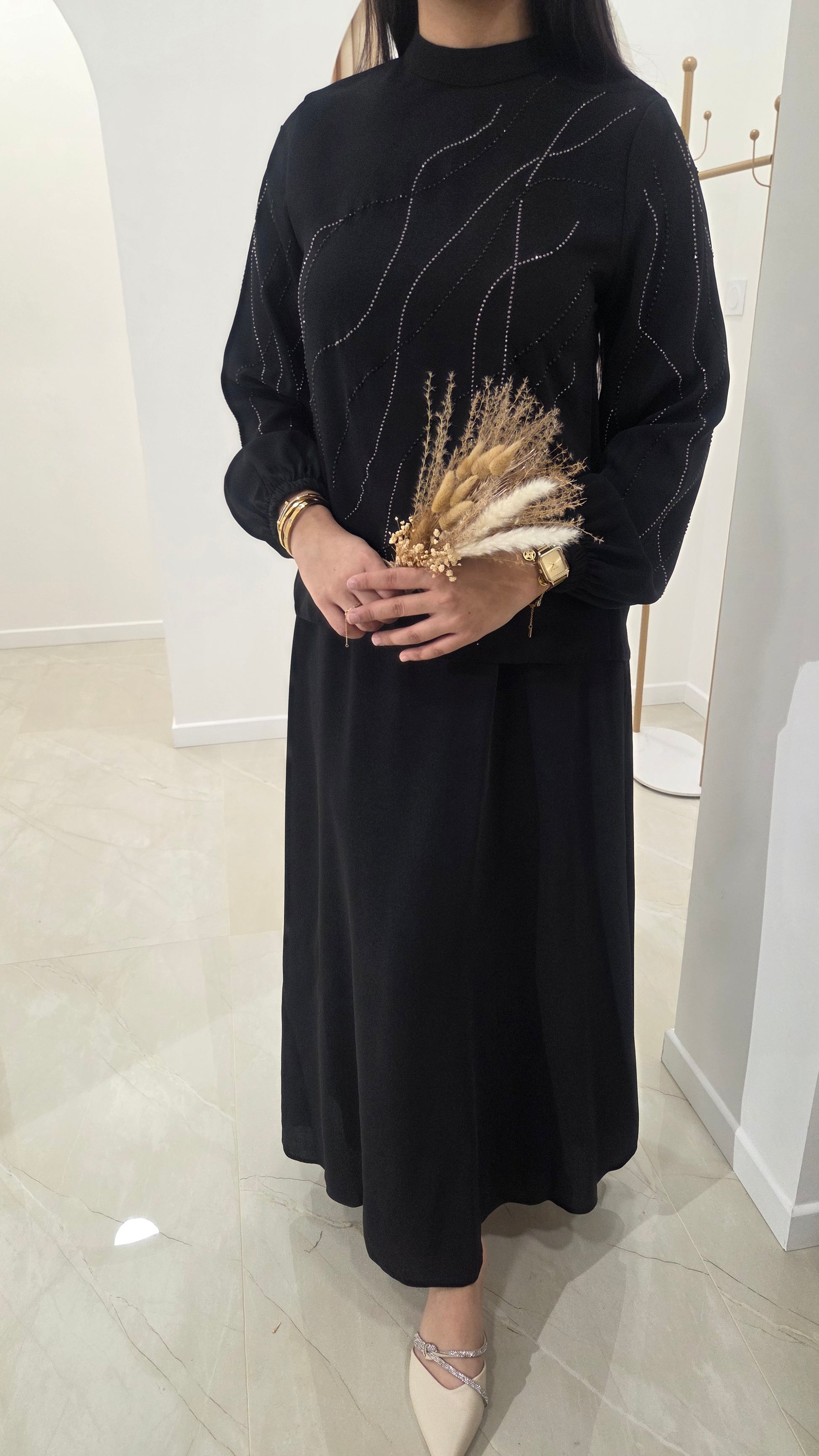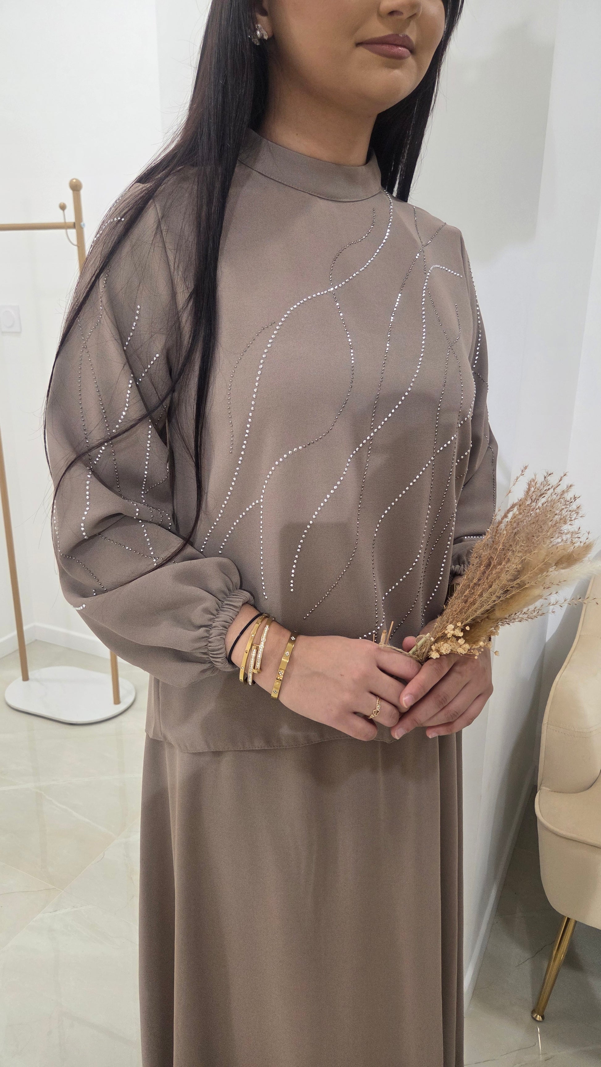 Ensemble composé d'une jupe évasée et d'une blouse manches bouffantes à strass .