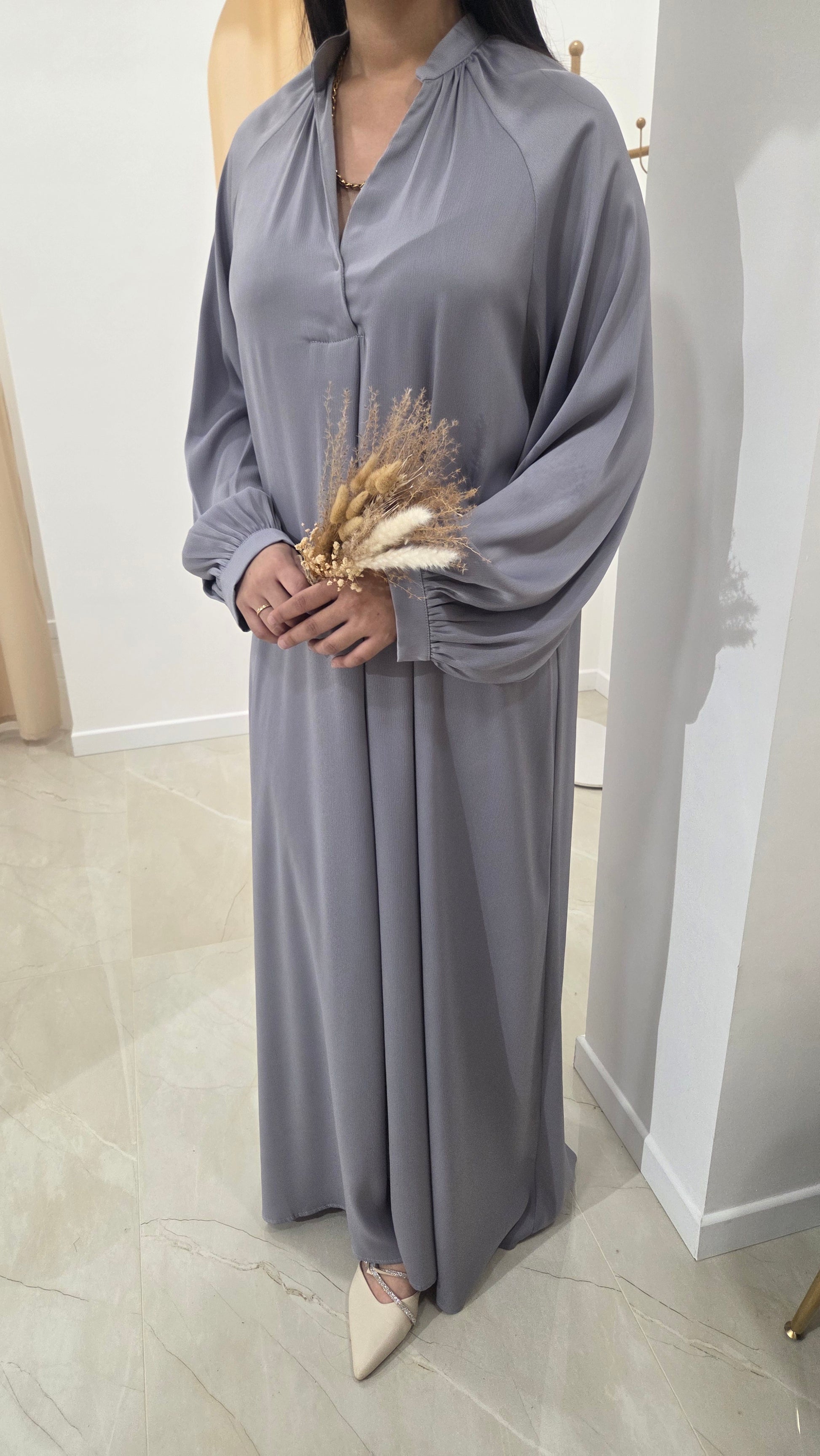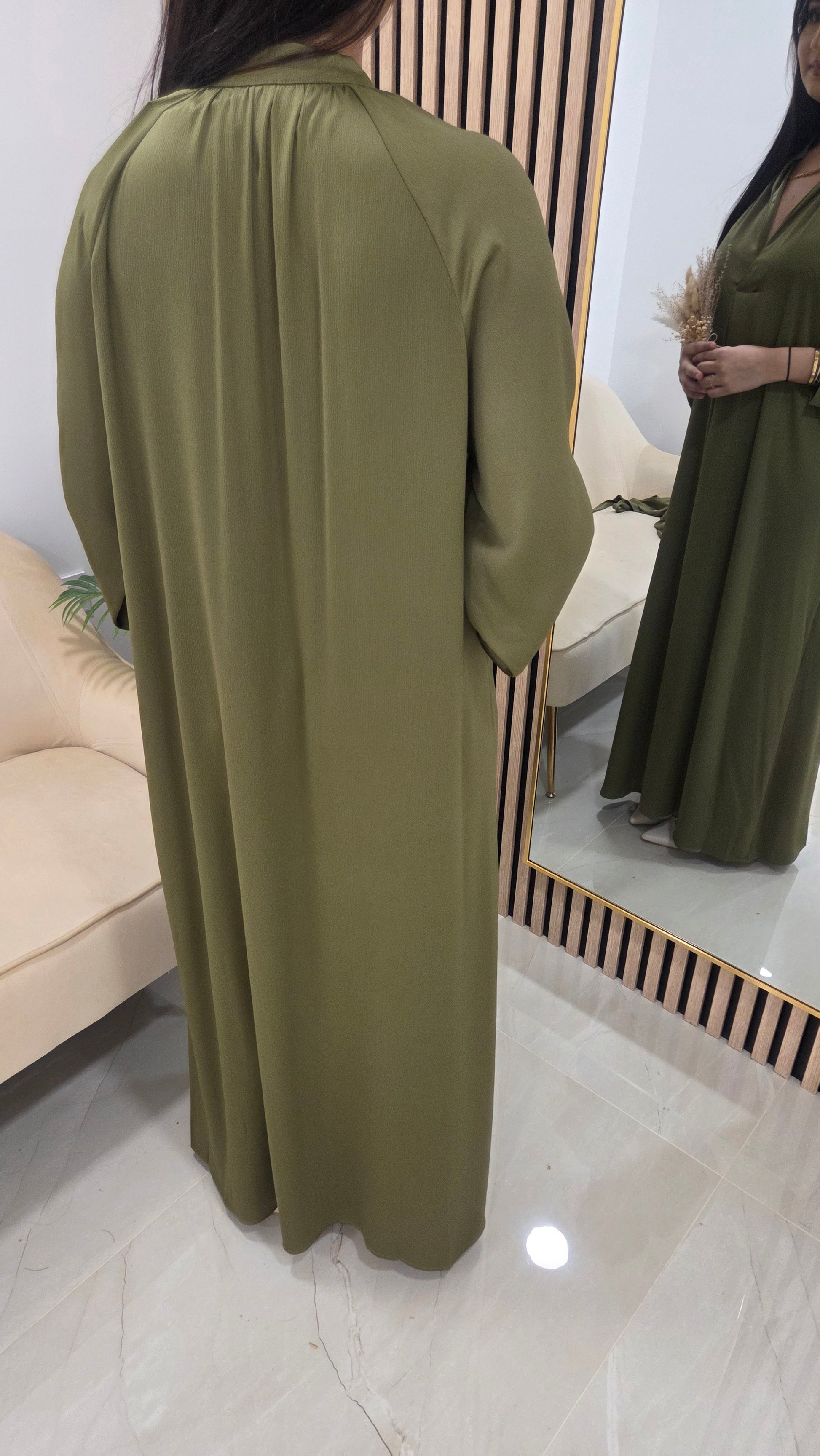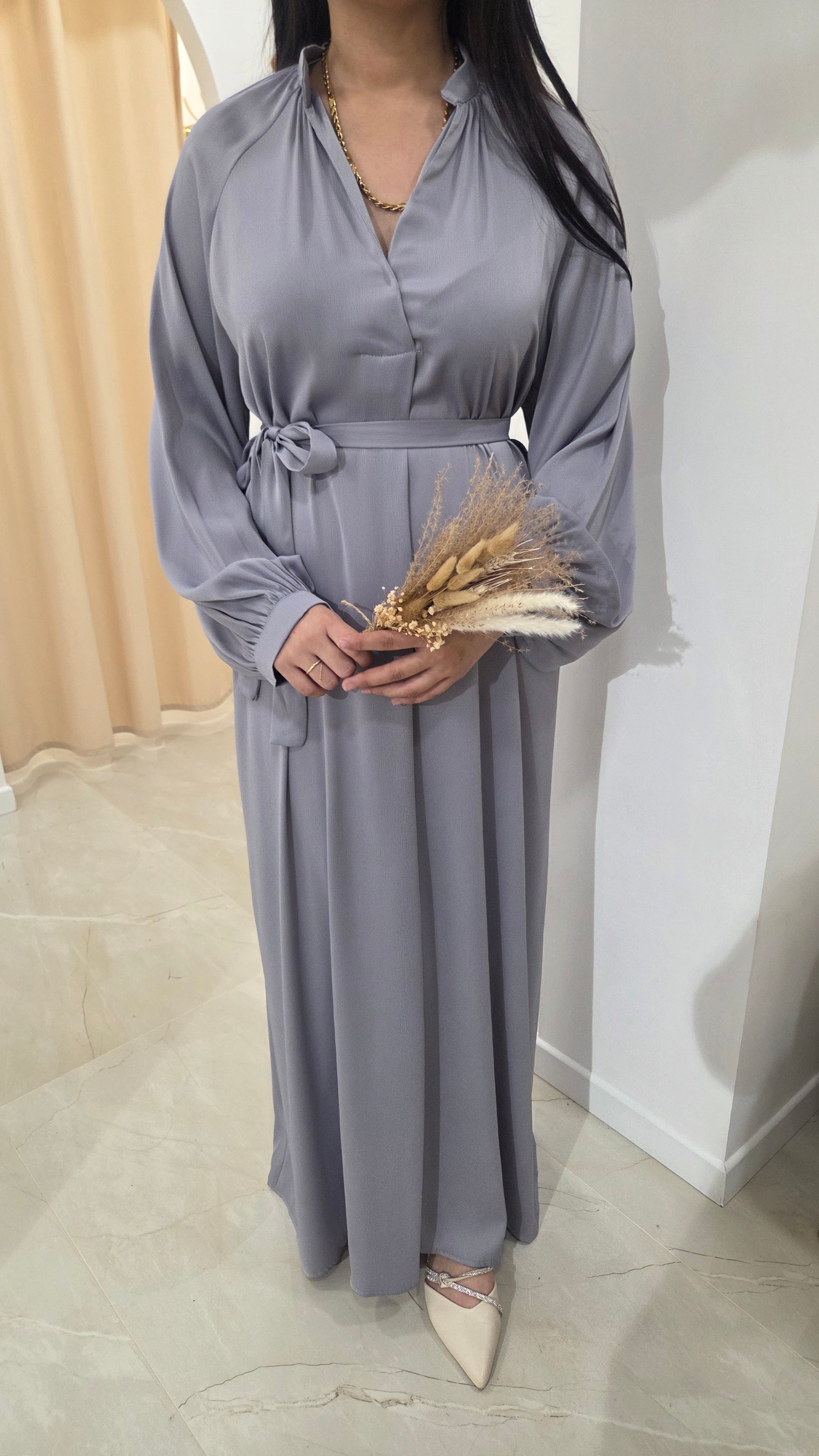 Jolie robe satinée col V , manches avec bouton , ceinture incluse .