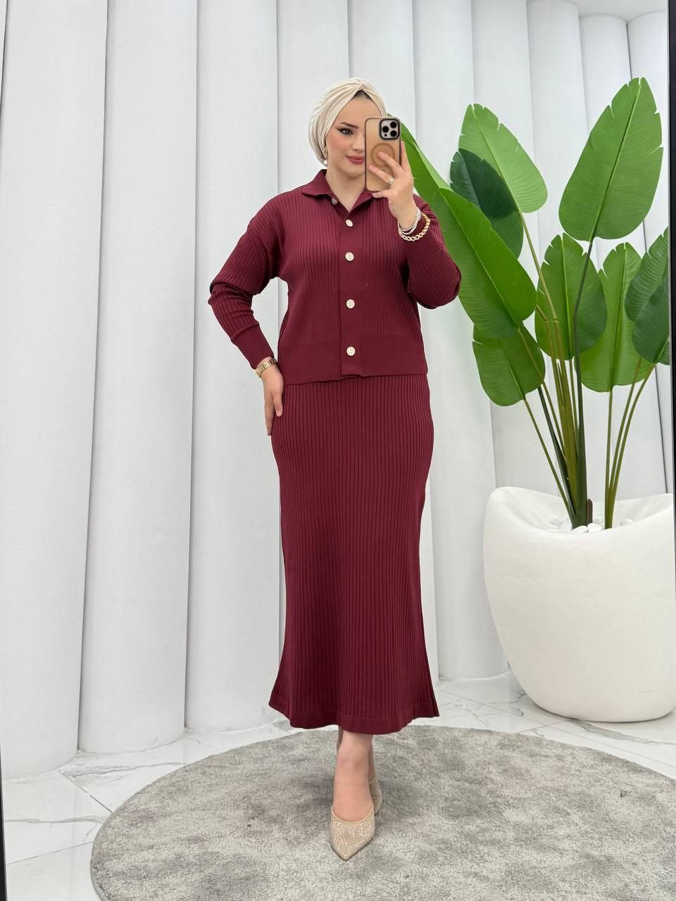 Jolie ensemble fine maille, composé d'une jupe taille élastique et d'un haut type cardigan, ouverture par bouton sur toute la poitrine.