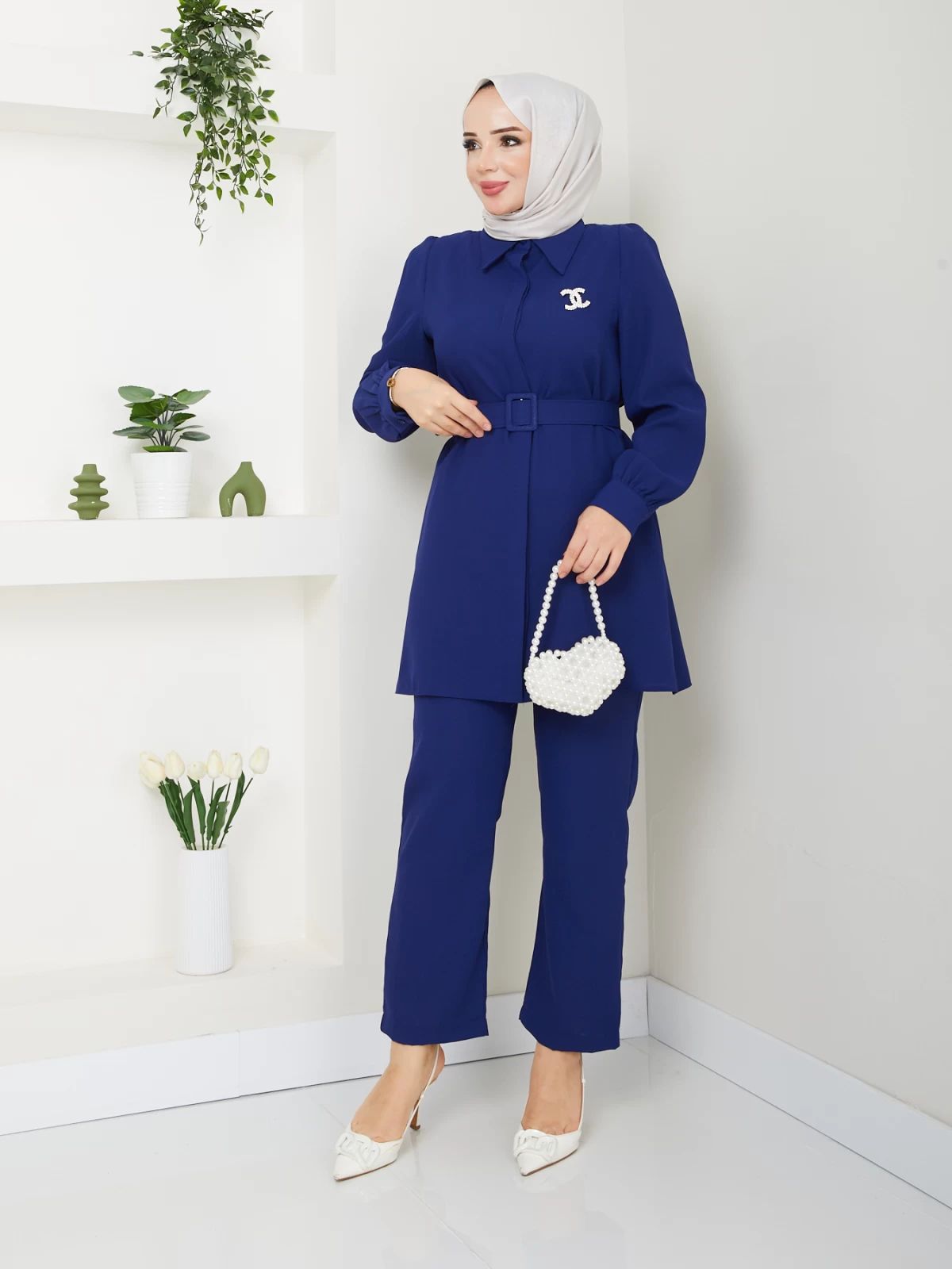 Ensemble deux pièces composé d'un pantalon taille élastique et d'une tunique longue .ceinture incluse.