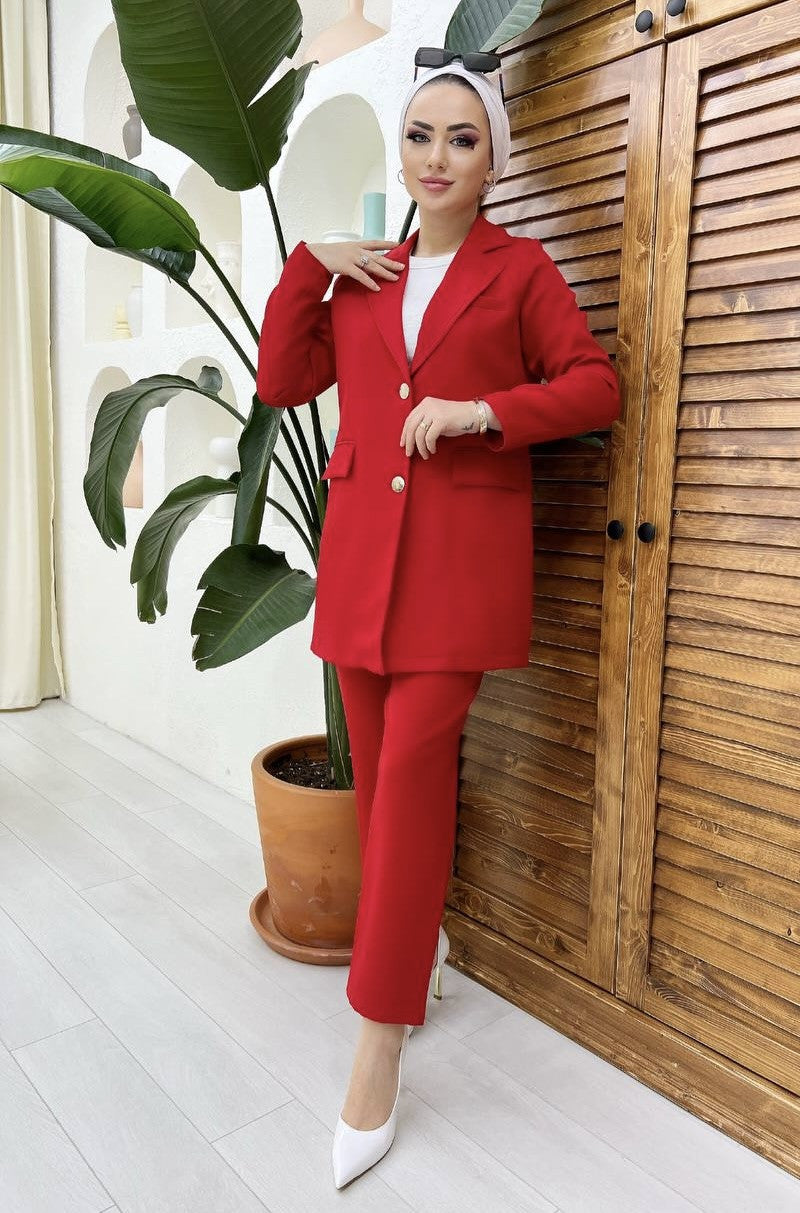 Ensemble tailleur composé d'un pantalon taille élastique , et un tailleur entièrement doublé fermé par 2 boutons avec 2 poches .