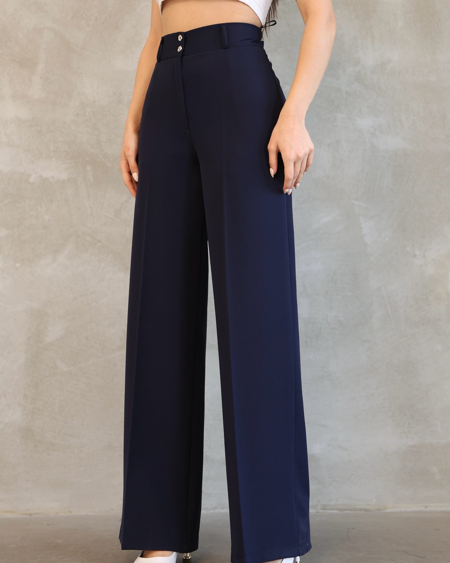 Pantalon taille haute semi élastique, boutons et fermeture éclair.