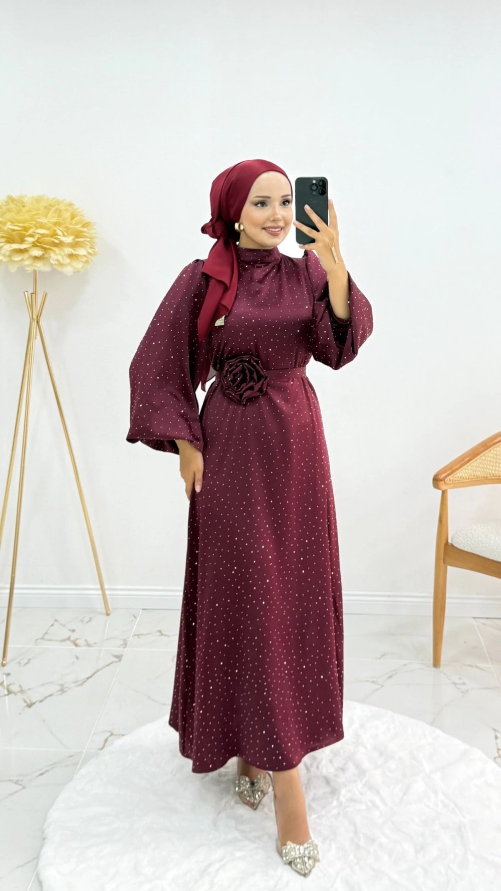 Jolie robe satinée à strass avec ceinture fleur ,col rond ,fermeture éclair dans le dos , manches bouffantes.