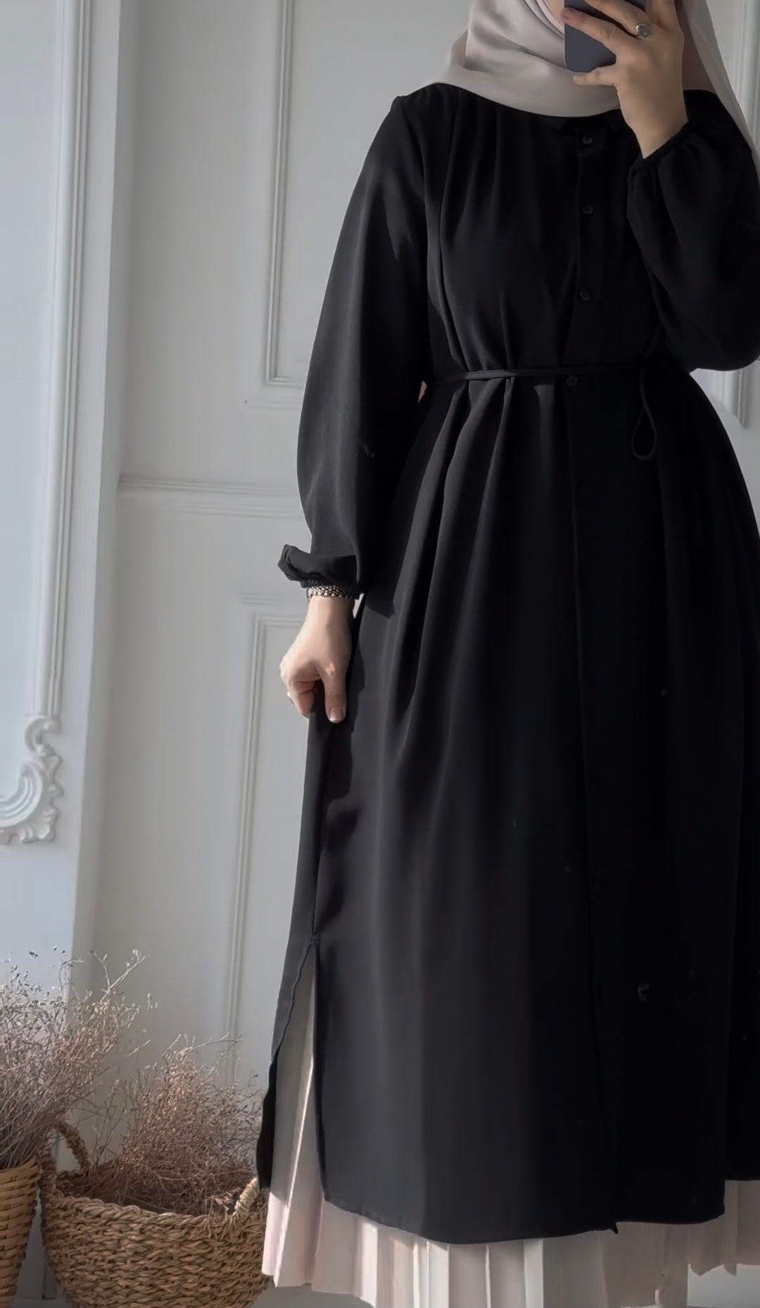 Jolie tunique longue et ample entièrement boutonnée, col chemisier avec fine ceinture, petite fentes sur les côtés.